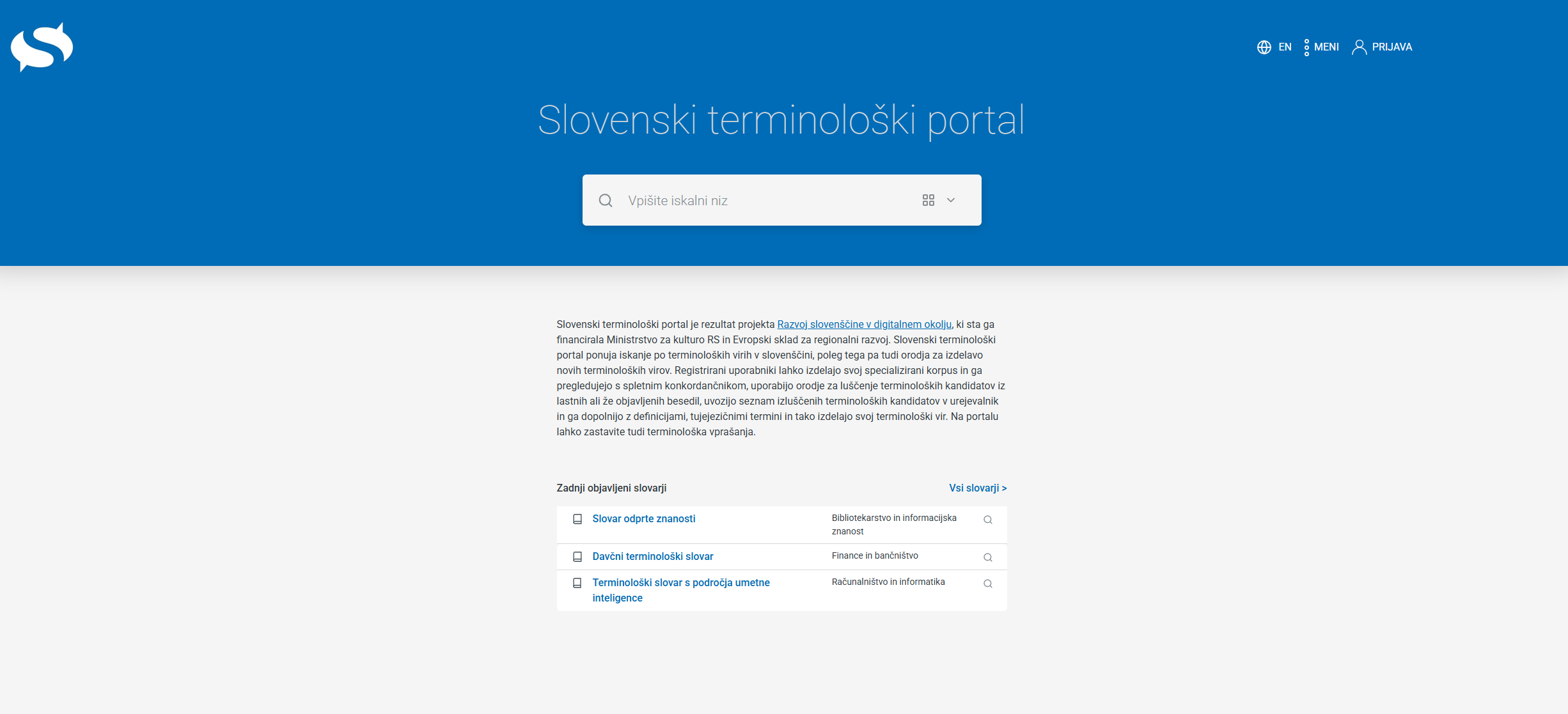 V zgornjem levem kotu se nahaja gumb z logotipom slovenscina.eu. S klikom na logotip se lahko vedno vrnemo na začetno stran Terminološkega portala.