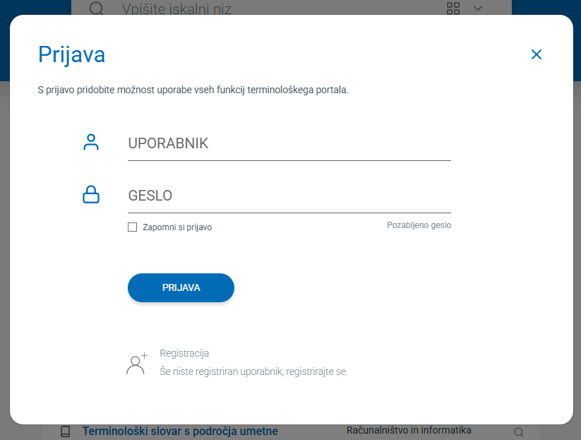 - Gumb "PRIJAVA" odpre pogovorno okno, v katerega lahko vpišemo svoje podatke in se tako prijavimo na platformo. Navodila za registracijo so natančneje razložena v razdelku Registracija novega uporabnika.