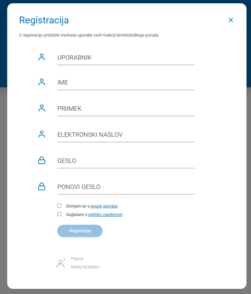 Na dnu okna se nahaja ikona za dodajanje novega uporabnika, kliknemo na napis "Registracija" in odpre se okno za vpis podatkov:Po vpisu podatkov prejme uporabnik na elektronski naslov, ki ga je navedel ob registraciji, potrditveno sporočilo, s klikom nanj pridobi možnost vpisa na platformo.