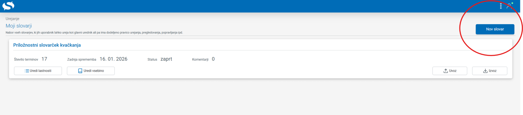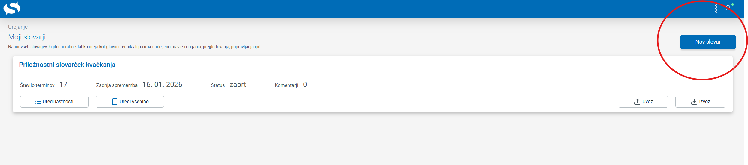 Za izdelavo novega slovarja v spustnem meniju izderemo zvihek Urejanje. V zgornjem desnem kotu kliknemo na gumb "Nov slovar".